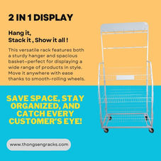 Versatile metal rack with top hanger rail and deep wire basket, designed to hang, stack, and showcase multiple product types while staying mobile on smooth-rolling caster wheels.